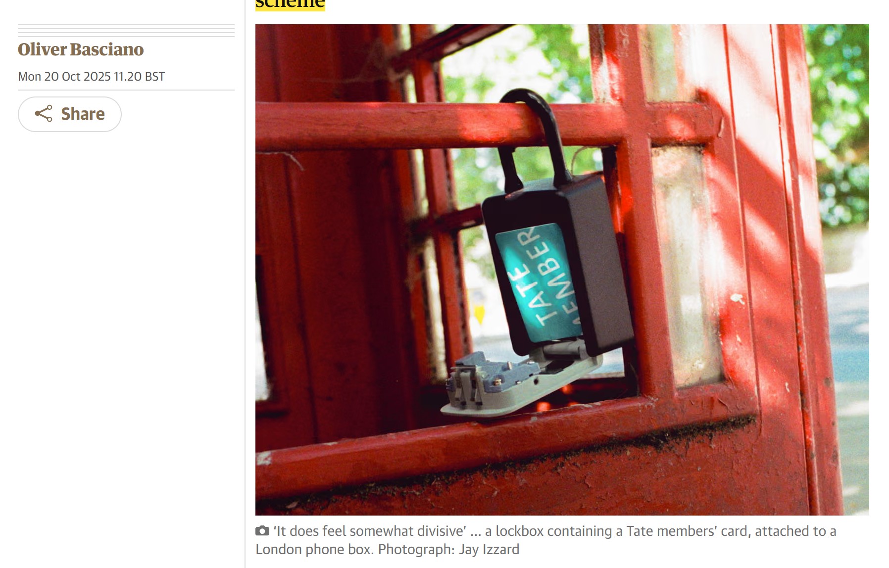 On a railing, not far from Tate Modern, is a lockbox. Enter a code and inside is a membership card to the museum, enabling free access to its temporary exhibitions. You get your ticket, you return the card.